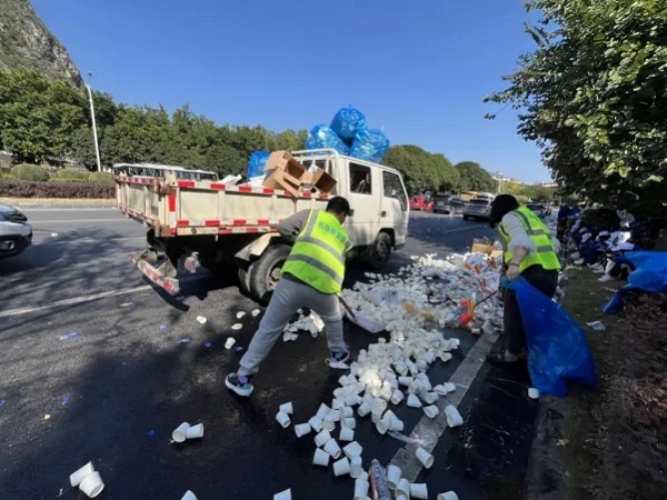 赛事当日凌晨5点,机场路/阳桂公司全体保障人员到岗开展最后巡查,通过人工敲击检查井盖、设施稳固性等细节,确保赛道平整安全。赛中实行“定点值守+动态巡查”模式,划分7个责任区域配备应急设备,同步落实环卫保障,实现“即时捡拾、动态清运”,确保赛事期间补给站周边无垃圾堆积。
