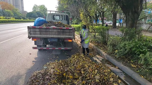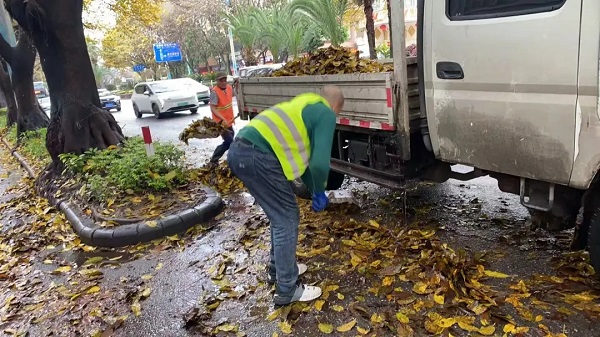 针对雨季落叶量大、降雨持续的特点,公司结合各路段堆积情况动态调整清运频次,统筹调配养护、维修车辆与人员力量,常规路段以清扫车巡回保洁为主,香江饭店至中隐路核心非机动车道人流密集、大型车辆作业易拥堵,采取“人工清扫归拢+车辆循环清运”精细化模式兼顾效率与通行安全。